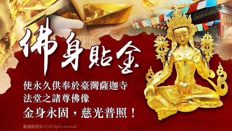 誠摯邀請十方善信大眾,共同發心護持臺灣薩迦寺諸尊佛像貼金工程。讓我們一起成就這項莊嚴佛像的殊勝事業,使金身永固,慈光普照,令有緣眾生常浴佛恩,共沐法喜。