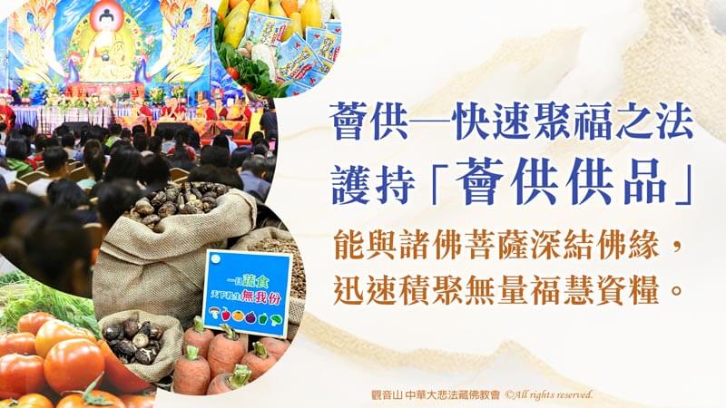 法會圓滿後,薈供品由觀音山代表捐贈至觀音山 蔬食館、需要的單位或弱勢族群,推廣素食愛心公益,與十方大眾廣結善緣,令每一位護持者功德更為增勝。