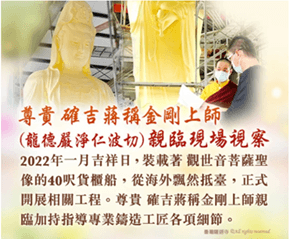2022年1月吉祥日,裝載著 觀世音菩薩聖像的40呎貨櫃船,從海外飄然抵臺,著手進行相關工程。尊貴 龍德上師親臨現場視察相關工作,並加持指導專業鑄造工匠相關細節。