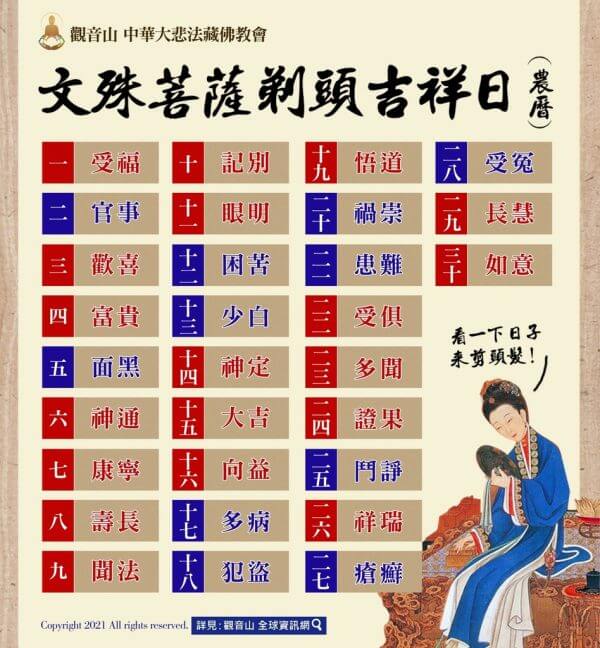 文殊菩薩所示剃頭吉日(農曆),提供十方善信法友參閱,大眾可於需要時比對圖中農曆日期,作為判斷是否合適剪頭髮的依據。