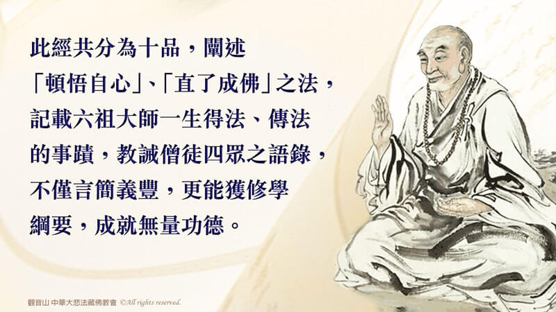 此經共分為十品,闡述「頓悟自心」、「直了成佛」之法,記載六祖大師一生得法、傳法的事蹟,從一位不識文字的砍柴少年,成為一代宗師的過程;亦闡明禪宗的傳承和啟導門人的言教,為三十七年所說法要的總結,不僅言簡義豐,更能獲修學綱要,成就無量功德。