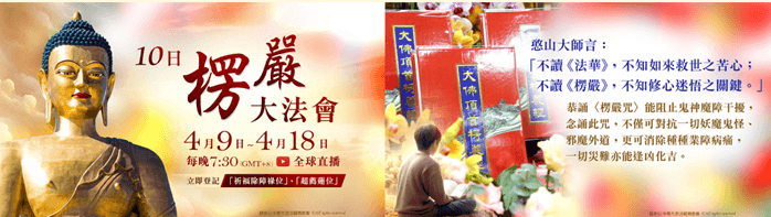 觀音山 4月9日~4月18日 十日楞嚴大法會,敬邀全球善信法友透過觀音山 法藏YouTube 全球直播,共同恭誦《楞嚴經》、〈楞嚴咒〉。