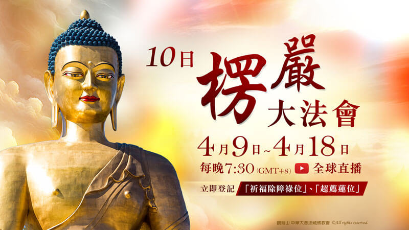 觀音山 4月9日~4月18日 十日楞嚴大法會,敬邀全球善信法友透過觀音山 法藏YouTube 全球直播,共同恭誦《楞嚴經》、〈楞嚴咒〉。